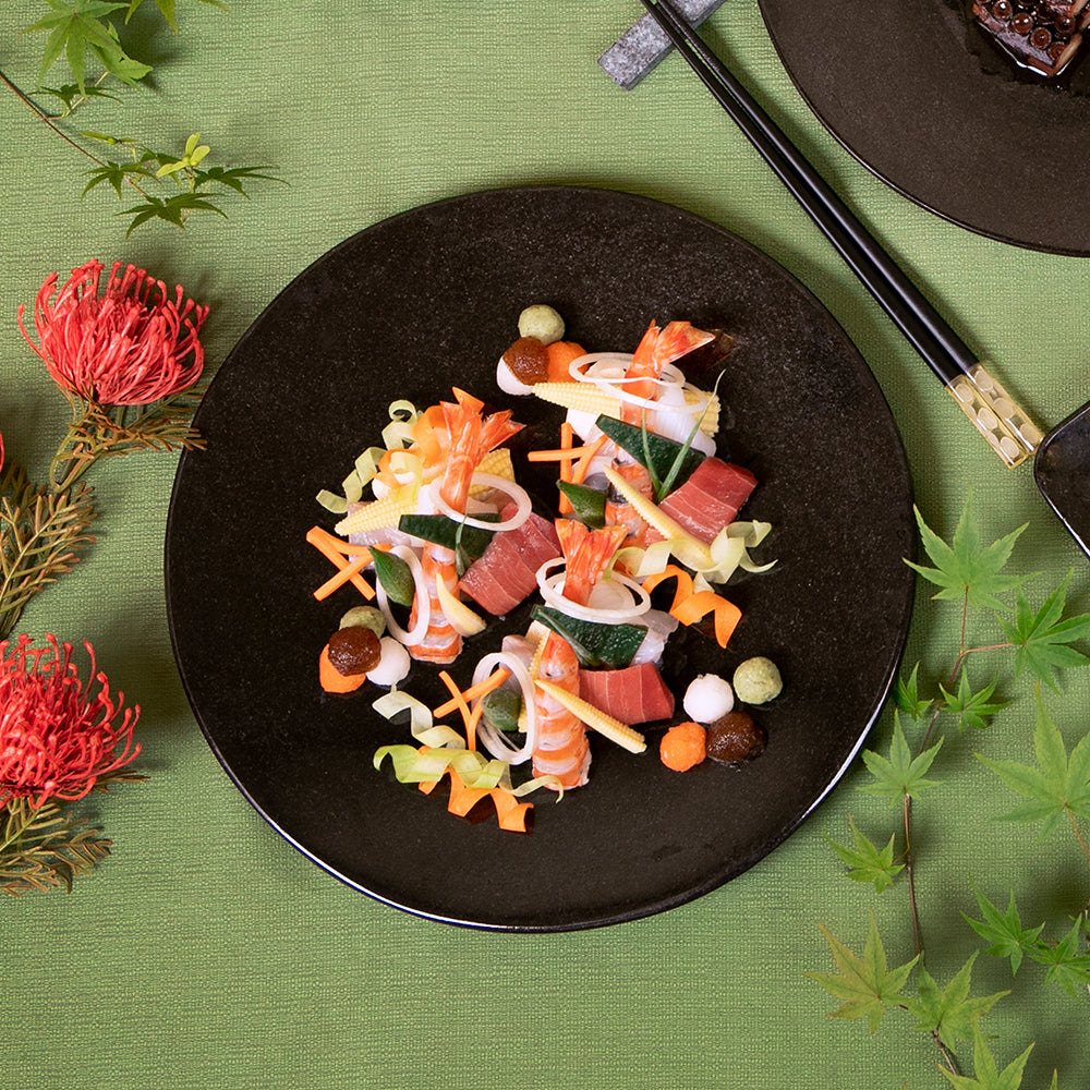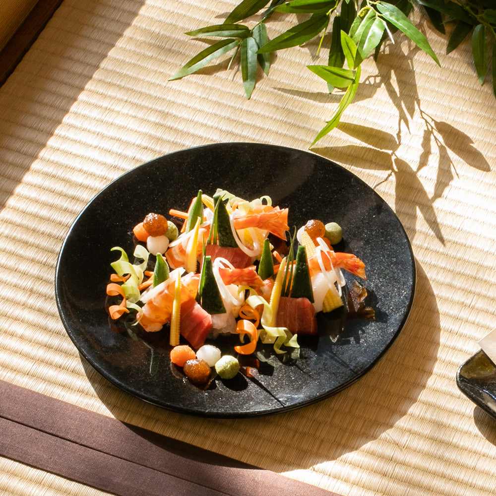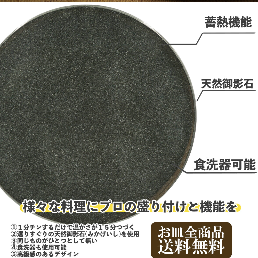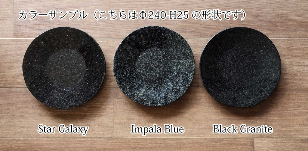 直径28cmと大きく、ホテルやレストランのメインディッシュやボリュームのある料理向きです。みかげ石の特性を活かすことで、耐久性に優れ、光沢感があり、他にない高い保温性や保冷性を実現いたしました。落ち着いたカラーと高級な風合いで料理の魅力をより引き立たせ、素敵な食事の空間を演出いたします。